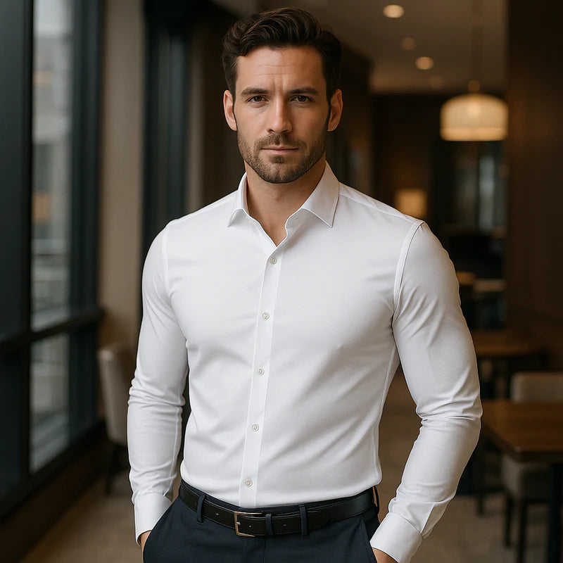Start your day ready to impress. The Privazz Infinity™ Wrinkle-Free Slim Fit Shirt stays perfectly smooth and sharp without ever needing to be ironed. Thanks to its innovative fabric, you’ll look effortlessly refined — from office meetings to evening dinners.